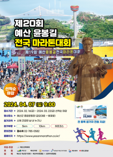 [예산]제20회 예산 윤봉길 전국마라톤대회가 오는 4월 7일 예산읍 일원에서 열린다.