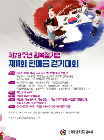 [예산]제79주년 광복절 기념 한마음 걷기대회가 오는 15일 예산초등학교에서 열린다.