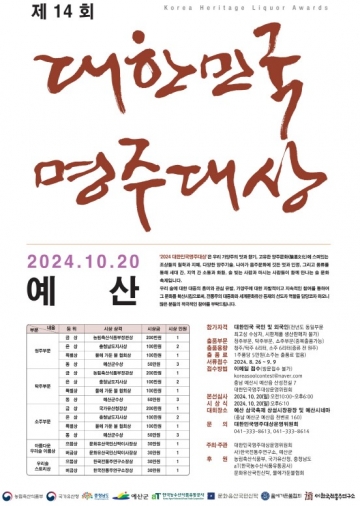[예산]올해 최고의 전통 명주를 선정하는 ‘제14회 대한민국 명주대상&명주페스타’가 오는 17일부터 20일까지 예산상설시장에서 열린다.