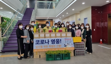 이날 회원들은 장기화된 코로나19로 연일 땀방울을 흘리는 보건소 의료진과 관계자 등 180명을 위해 쿠키, 식혜 및 프리지어 꽃다발을 준비해 따뜻한 응원과 함께 고마운 마음을 전했다.